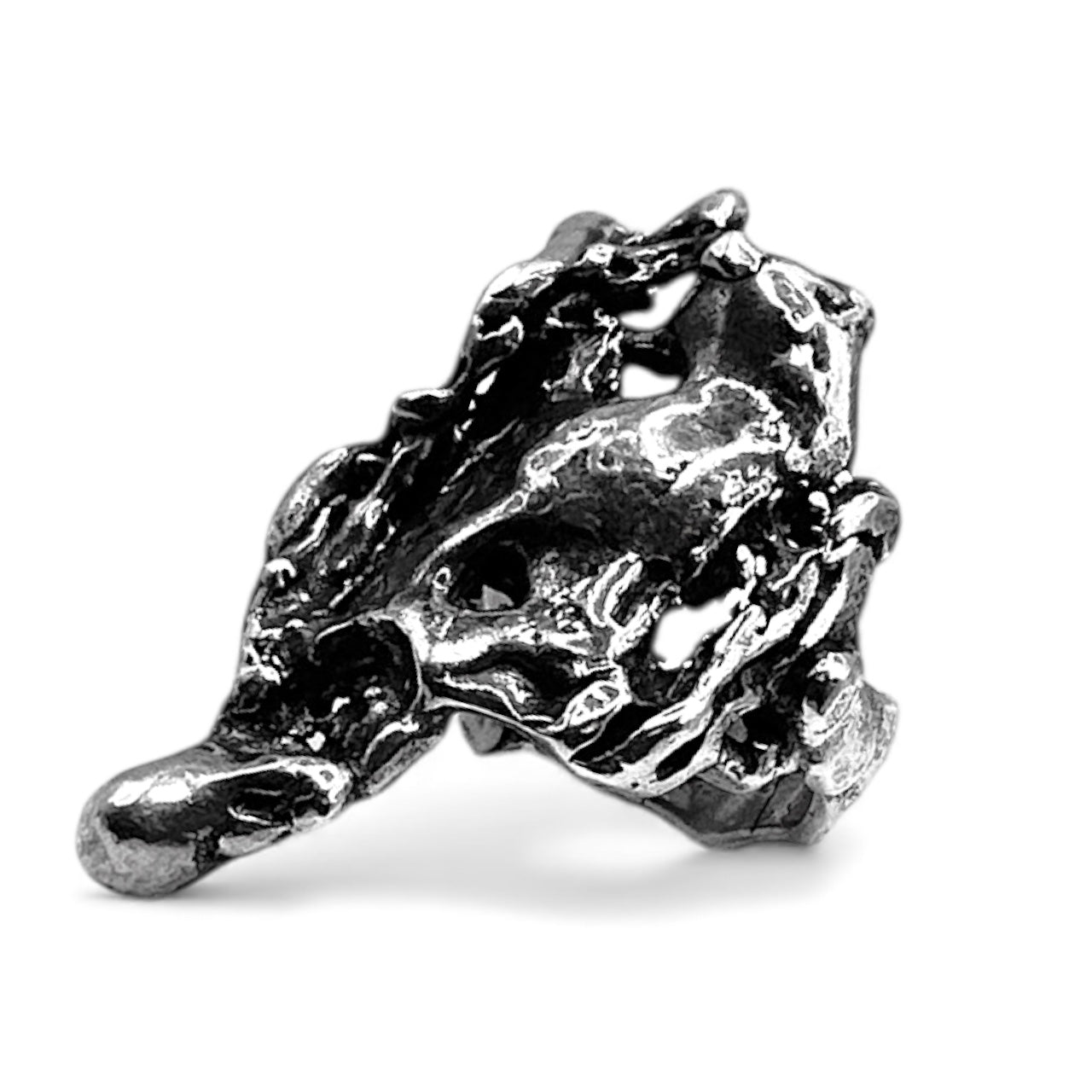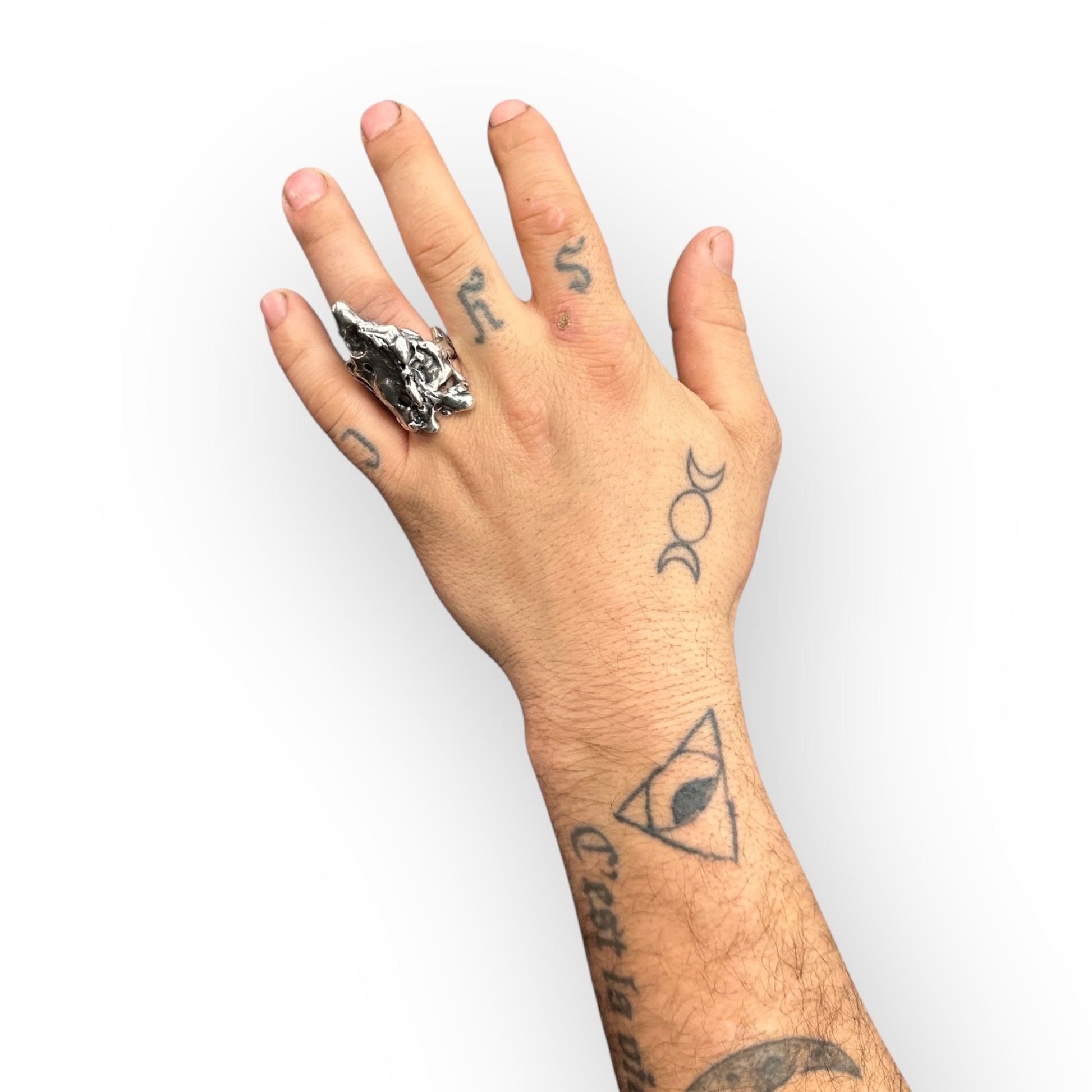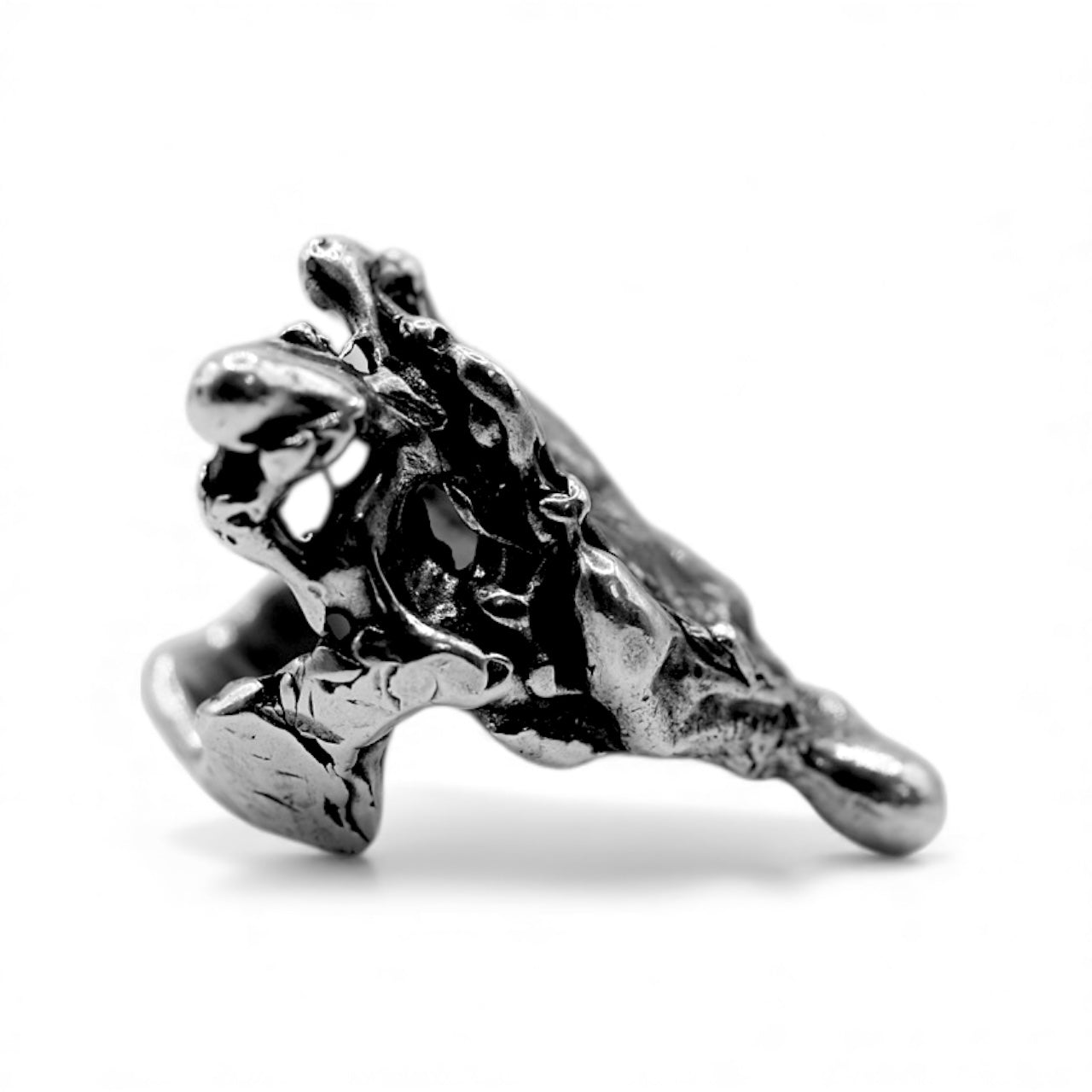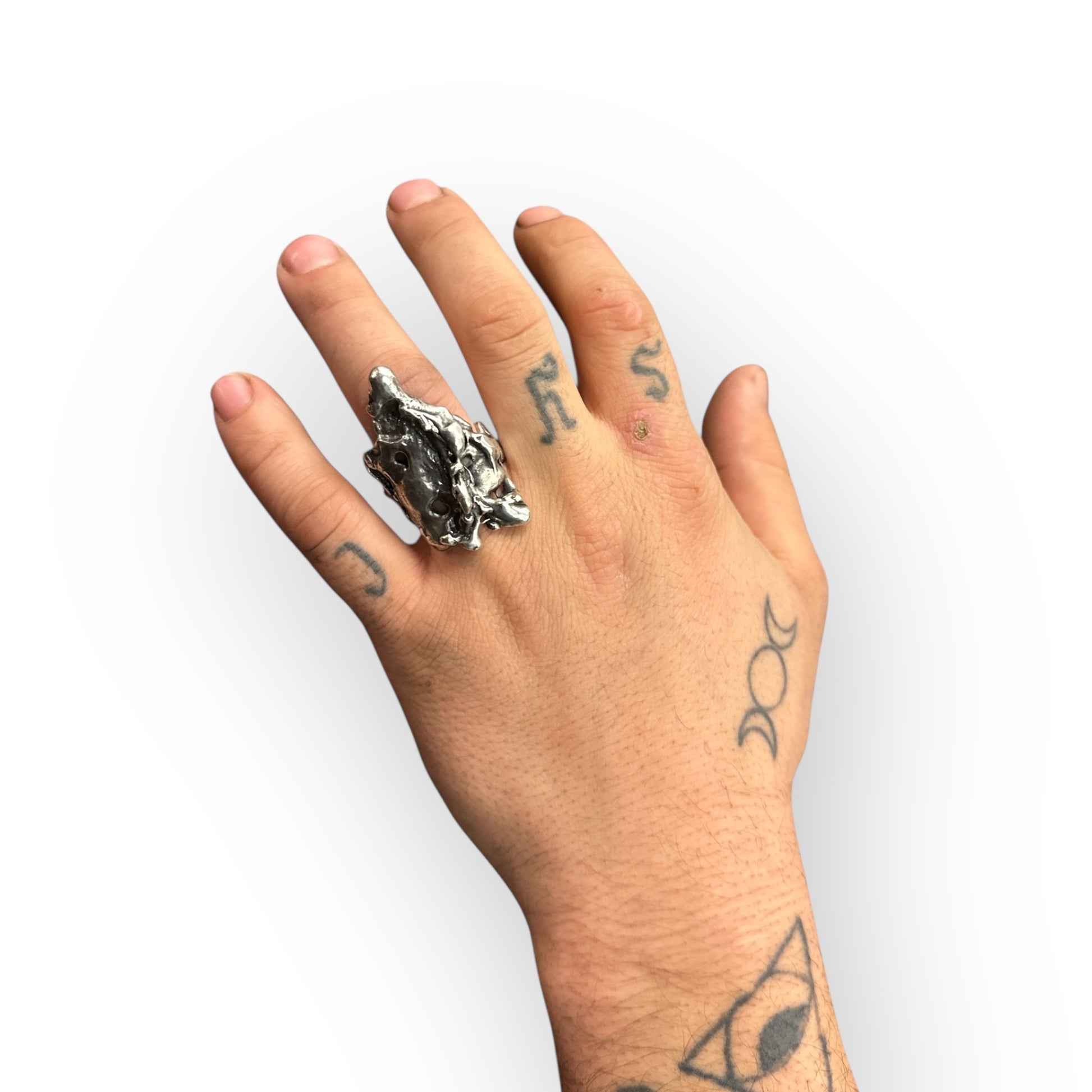 This version is entirely new—but it carries the ghost of the original inside it. A molten, brutalist sculpture forged from the remnants of another vision. Crafted in oxidized .925 sterling silver, the Revise Ring is a wearable relic of creative destruction—proof that breaking something apart is sometimes the only way to find what it was meant to become.