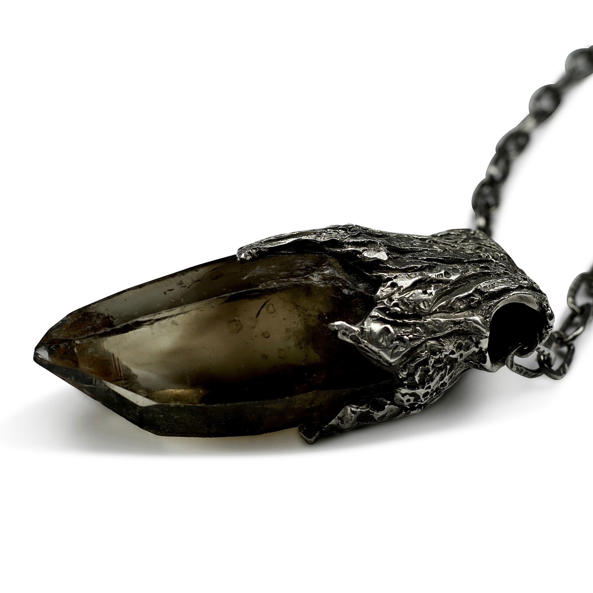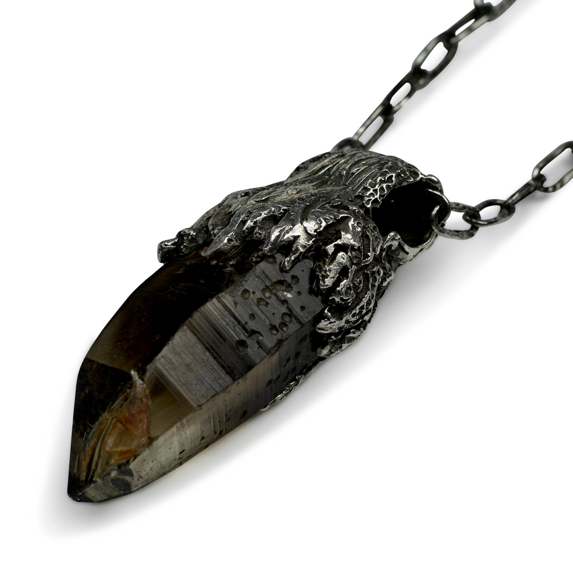 Description: The Transcend one of a kind necklace is made up of .925 oxidized silver and raw, naturally detailed citrine which promotes motivation, activates creativity and emotional balance. Citrine also encourages self-expression, enhances concentration, revitalizes the mind.. all while releasing negative traits, depression, fears and phobias. This particular citrine crystal holds the upmost unique traits. It can look dark or extremely light depending on where it is placed. The natural details within and outside of the stone heavily resonate with the signature AS texture “Burnt”. So it came as no surprise that Alex placed this beauty with that particular signature texture as there is no doubt that that texture was meant to be with this particular stone.